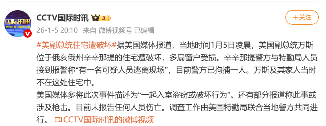 据美国媒体报道,当地时间1月5日凌晨,美国副总统万斯位于俄亥俄州辛辛那提的住宅遭破坏,多扇窗户受损。