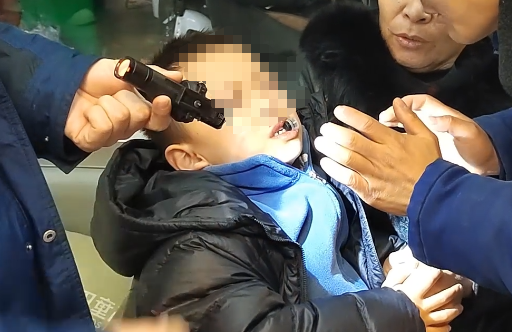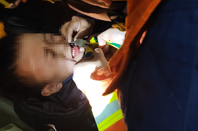鞋扣与男孩嘴唇贴合较紧。图源:洛阳消防