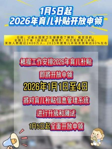 2025年7月,国家出台《育儿补贴制度实施方案》,明确规定为3周岁以下婴幼儿提供每孩每年3600元的补贴,切实减轻家庭育儿负担。根据工作安排,2026年育儿补贴于1月5日起全面开放申领。