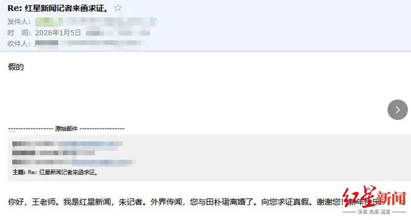 针对网传“王石与田朴珺离婚”的说法,1月5日晚,万科集团创始人王石独家回复红星新闻记者,称是“假的”。几小时前,田朴珺也是这么回答记者,夫妻二人口径完全一致。