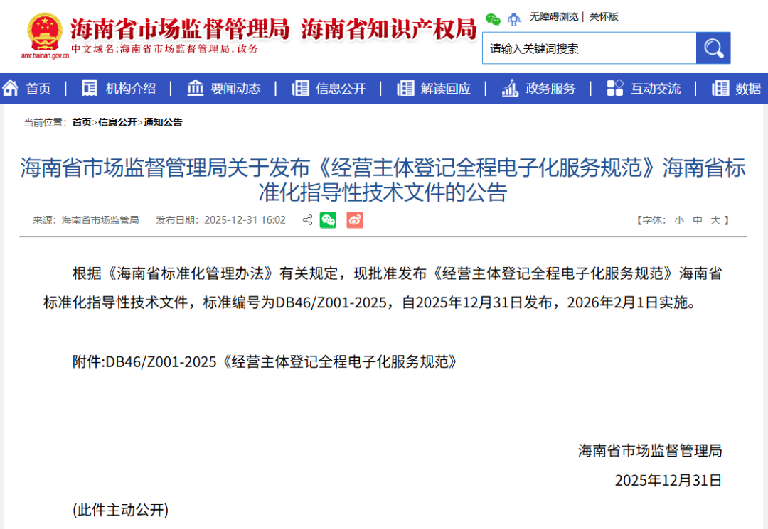 近日,海南省地方标准化指导性技术文件《经营主体登记全程电子化服务规范》获批准发布,自2026年2月1日起实施。这是记者近日从海南省市场监督管理局获悉的。