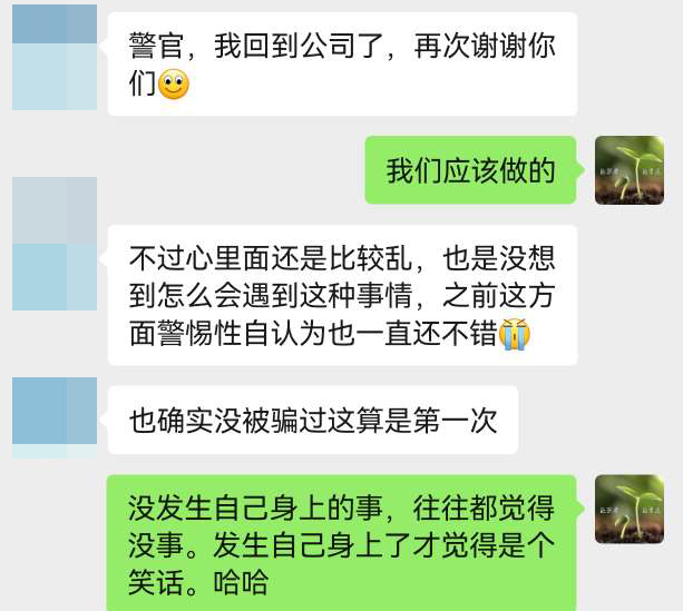 在反诈队员的陪同下,郑先生将现金重新存入银行账户。“我一直以为自己警惕性不错,怎么也没想过会被骗,真的太感谢你们了。”事后,郑先生发消息向反诈队员表示感谢。