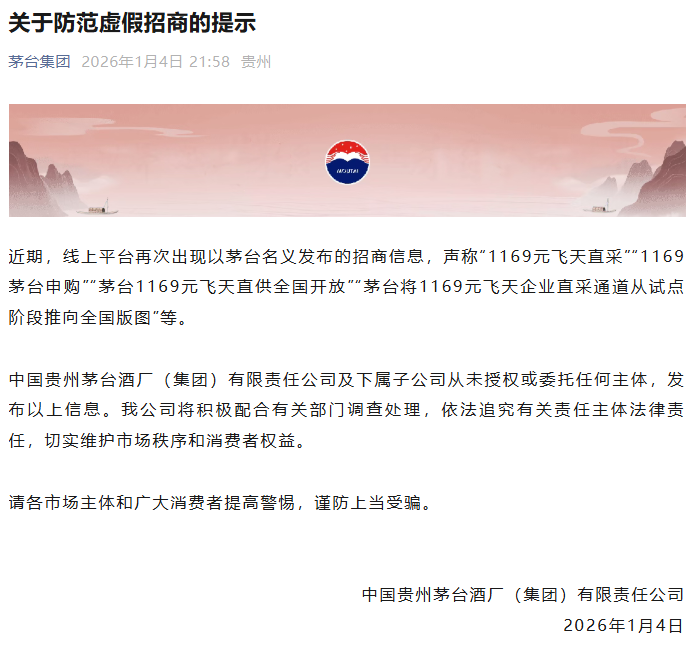 1月4日晚,茅台集团发布关于防范虚假招商的提示: