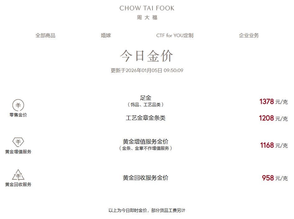 同日,周大福足金饰品最新价格报1378元/克,老庙报1377元/克,周生生报1376元/克,老凤祥报1370元/克。