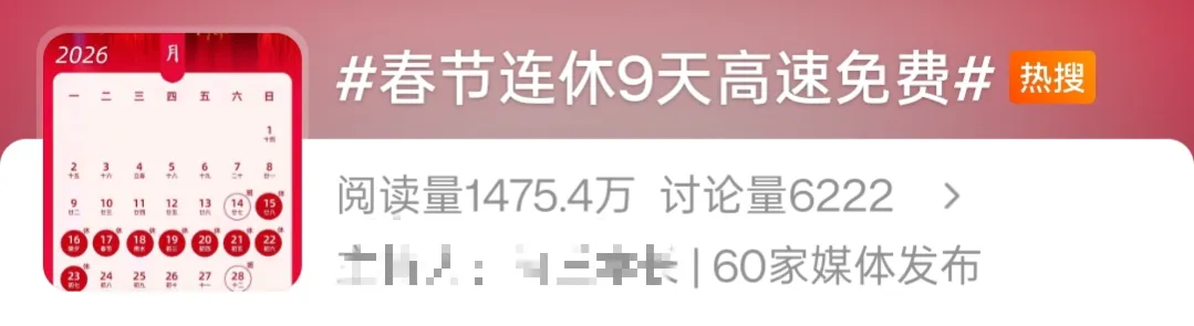 2026年全国春节高速免费时段为,2026年2月15日00:00至2月23日24:00,共计9天。