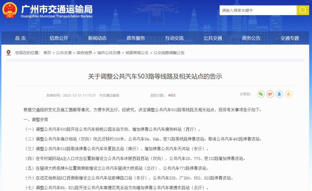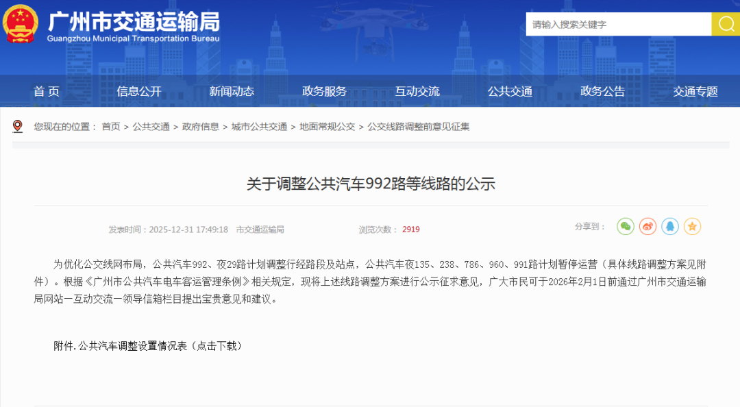 根据《广州市公共汽车电车客运管理条例》相关规定,现将上述线路调整方案进行公示征求意见,广大市民可于2026年2月1日前通过广州市交通运输局网站—互动交流—领导信箱栏目提出宝贵意见和建议。