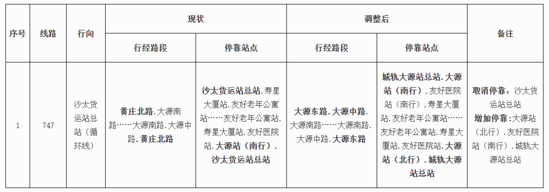 (十三)公共汽车747路由原公共汽车沙太货运站总站环线运作改为公共汽车城轨大源站总站环线运作,增加停靠公共汽车城轨大源站总站、友好医院站(南行)、大源站(北行)等站点,取消停靠公共汽车沙太货运站总站。