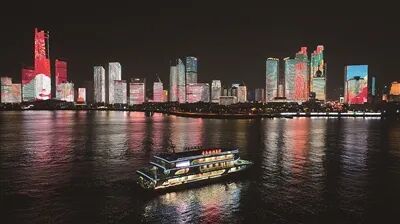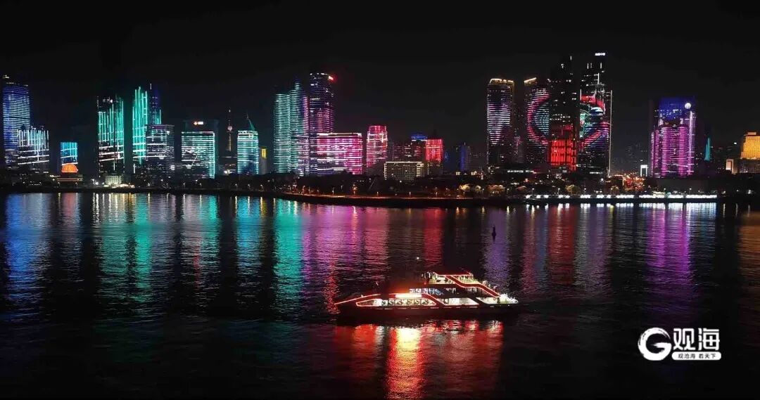 △游客乘坐海上游轮畅游浮山湾,欣赏灯光秀。 韩 星 摄