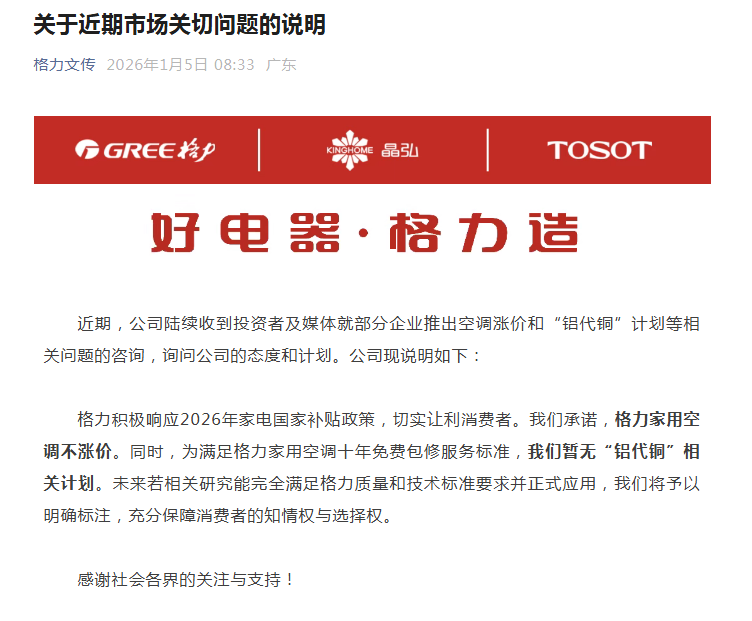 1月5日,珠海格力电器股份有限公司发布《关于近期市场关切问题的说明》,承诺格力家用空调不涨价,并表示暂无“铝代铜”相关计划。以下为详情——