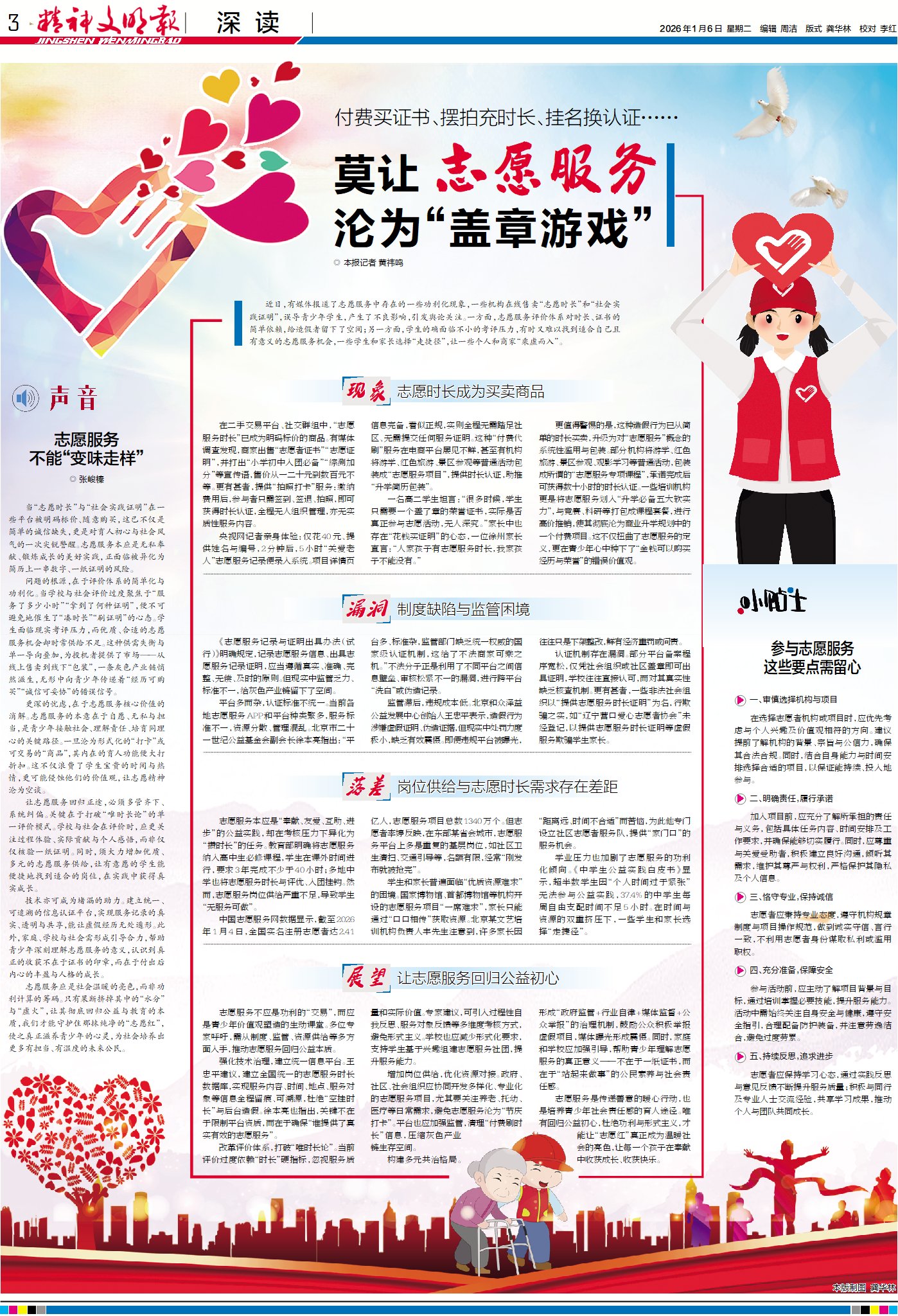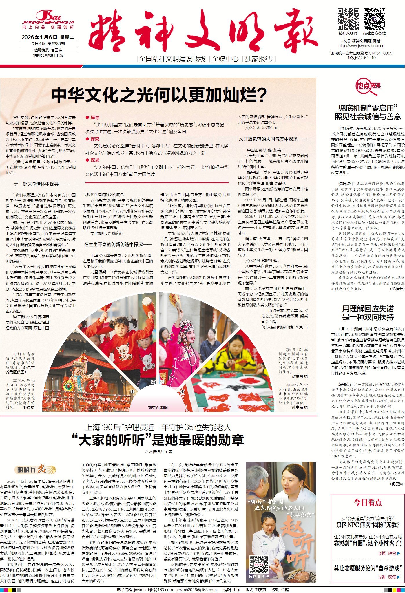 今日版面“早”知道:1版头条聚焦国家主席习近平在二〇二六年新年贺词中提及的文化事业发展成果,探讨中华文化何以更加灿烂;倒头条讲述上海“90后”护理员赵听听十年服务35位失能老人的事迹,展现耐心倾听与真心陪伴的温暖力量;《热点观察》关注湖南永州足球队夺冠后企业赠车承诺难兑现一事,球队与协会理解企业现状放弃履约要求,实现双向扶持;3版“深读”直击志愿服务“刷时长”等乱象,剖析背后困境并呼吁志愿服务回归纯粹真实。