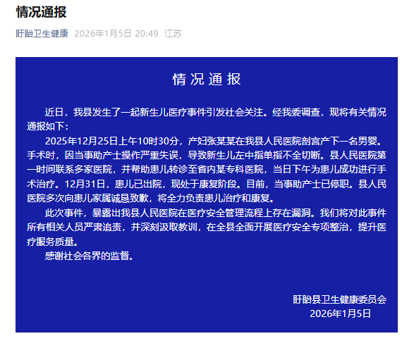 ·官方通报“新生儿被剪断手指”:助产士操作严重失误,已被停职。