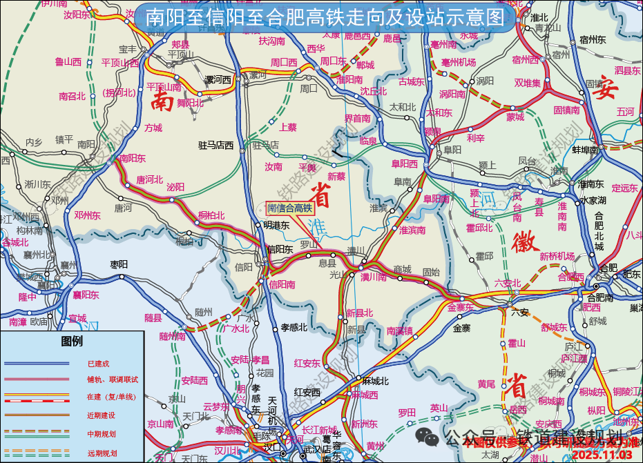 据悉,南信合高铁位于河南省南部及安徽省西部,连接河南省南阳市与信阳市,并延伸至安徽省合肥市,是西北、西南、鄂西北至长三角等地区一条新的高铁通道和豫南地区快速对接长三角地区的便捷客运通道,也是国家“八纵八横”高铁主通道的重要衔接线和沿江高铁的重要辅助通道之一。项目为国家“十四五”铁路发展规划研究建设项目。在2022年启动勘察设计前期工作,并于2024年5月底通过国铁集团预可研审查,2025年9月中旬通过可行性研究评审,11月初正式启动环评第一次公示。