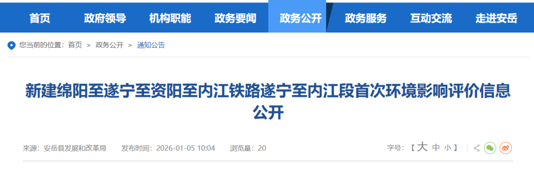 1月5日,新建绵阳至遂宁至资阳至内江铁路遂宁至内江段首次环境影响评价信息公开发布。项目环评工作正式启动,即将进入初步设计批复相关前置要件编制及审批阶段。根据公示: