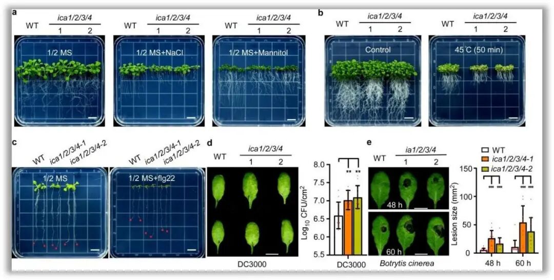 遗传学与细胞生物学证据显示,拟南芥中的 ICA1 、ICA2、ICA3和 ICA4 基因主要在根部表皮及皮层细胞表达,且蛋白定位于细胞质膜,提示其可能参与外界钙离子的摄取。常态下,在外源钙浓度正常时,ica1/2/3/4 四突变体与野生型相比,生长发育并无明显差异;胁迫下,当面临高盐、高渗、高温等非生物胁迫,或遭遇细菌(DC3000)、真菌(灰霉菌)等侵染时,ica1/2/3/4突变体表现出更高的敏感性,受损严重(图2)。