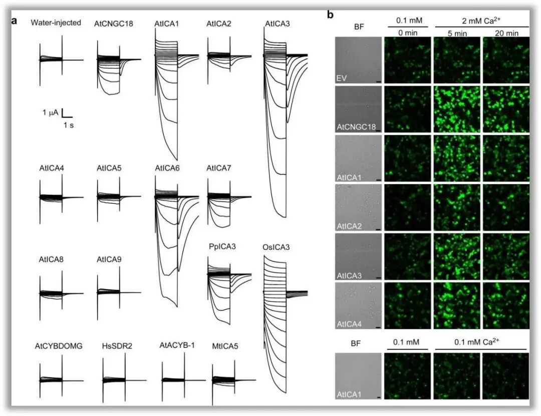 2026年1月5日,北京大学现代农学院、基因功能研究与操控全国重点实验室田望研究员课题组在国际植物学权威期刊 Nature Plants 发表题为“Arabidopsis IONIC CURRENT FAMILY A proteins facilitate environmental calcium acquisition essential for stress tolerance”的研究论文(DOI:10.1038/s41477-025-02179-3)。研究团队通过生物信息学分析与电生理实验相结合的策略,鉴定出一类植物特有的蛋白家族。电生理实验表明,该类蛋白在非洲爪蟾卵母细胞中表达时,能激发显著的Ca2+通透性非选择性阳离子电流。基于这一特征,研究人员将其命名为“离子电流家族A”(Ionic Current Family A,简称 ICAs)(图1)。