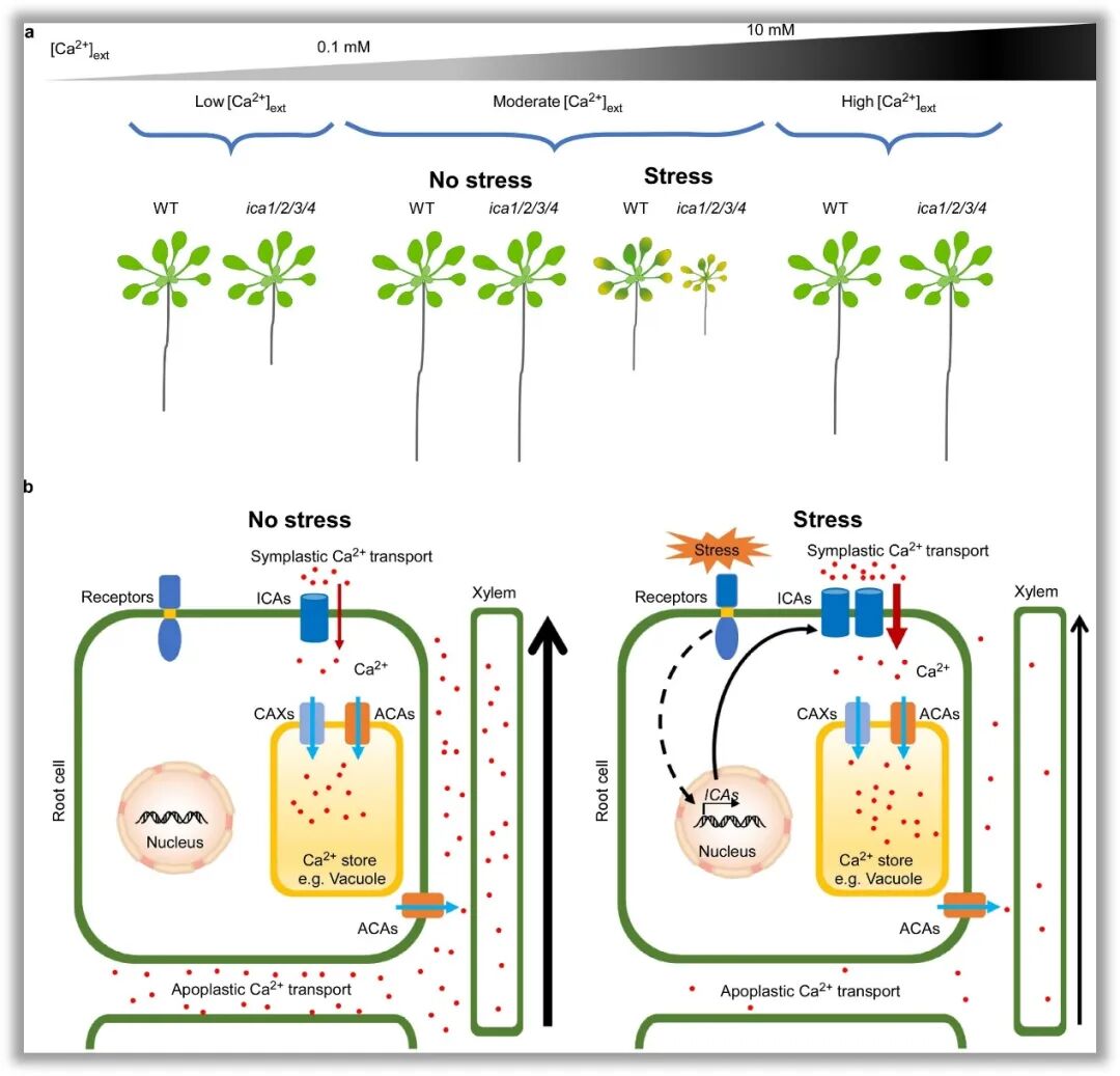 机制研究进一步揭示,突变体对环境胁迫的敏感性源于其根部钙吸收能力的减弱及体内钙含量的显著降低。这证实 AtICA1/2/3/4 的核心功能是介导外源钙营养的高效吸收,通过提升植物体内的钙水平,为植物穿上“铁布衫”,从而增强其对环境胁迫的抵抗能力(图3)。