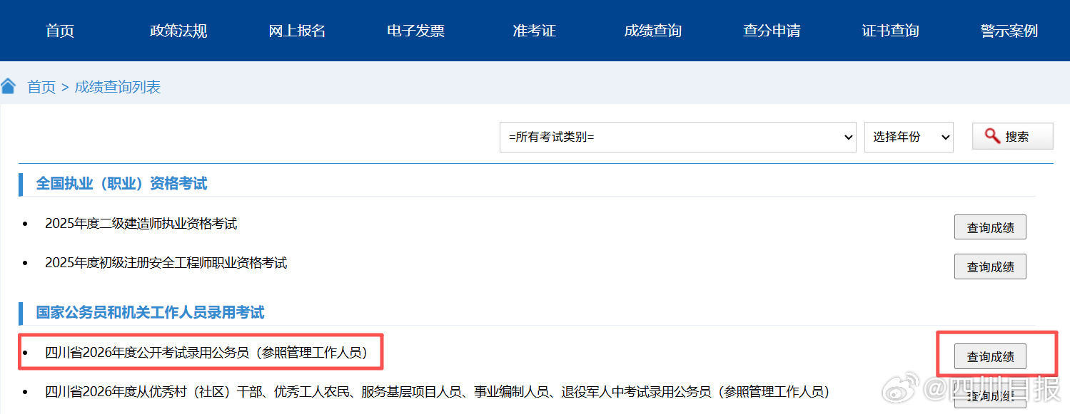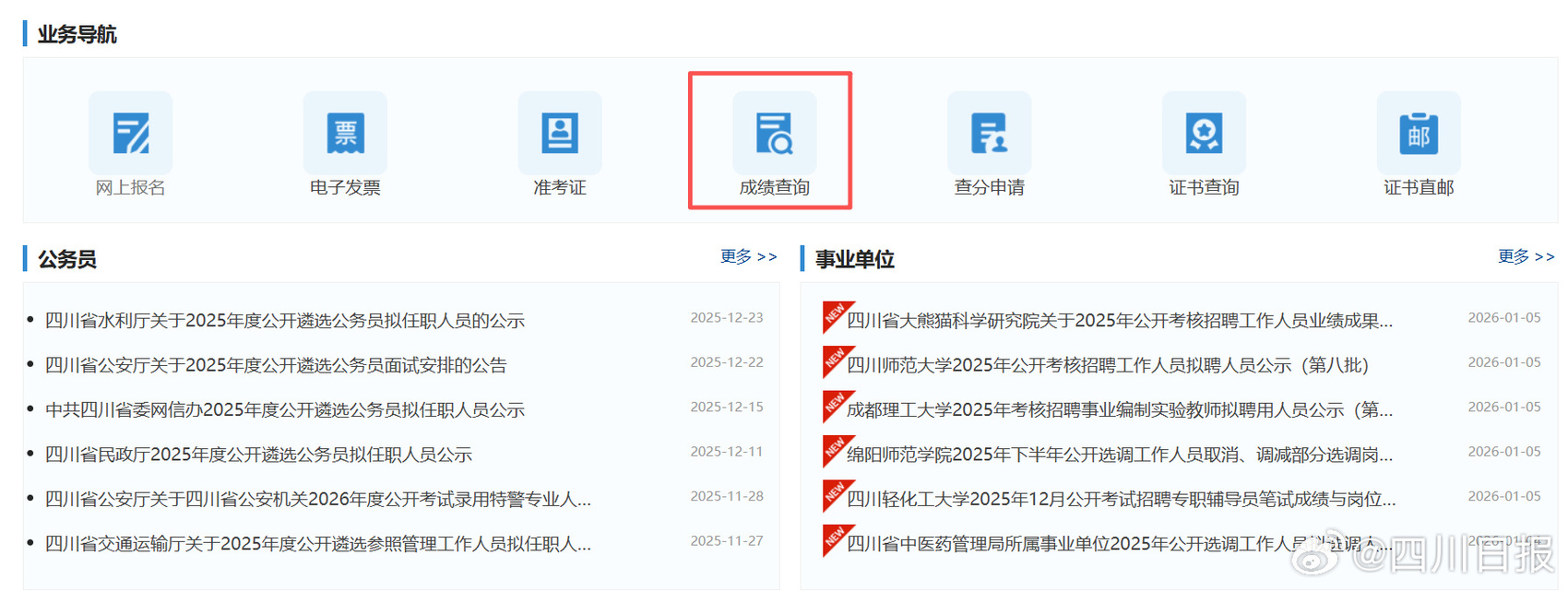 1月6日,四川省人力资源和社会保障厅网站更新考试成绩查询信息,更新信息显示,四川省2026年度公开考试录用公务员(参照管理工作人员)考试成绩已经可以查询。考生可在“四川省人力资源和社会保障厅网站—成绩查询入口”进行查询。面试时间暂定为2026年1月下旬至2月上旬。请各位考生持续关注!