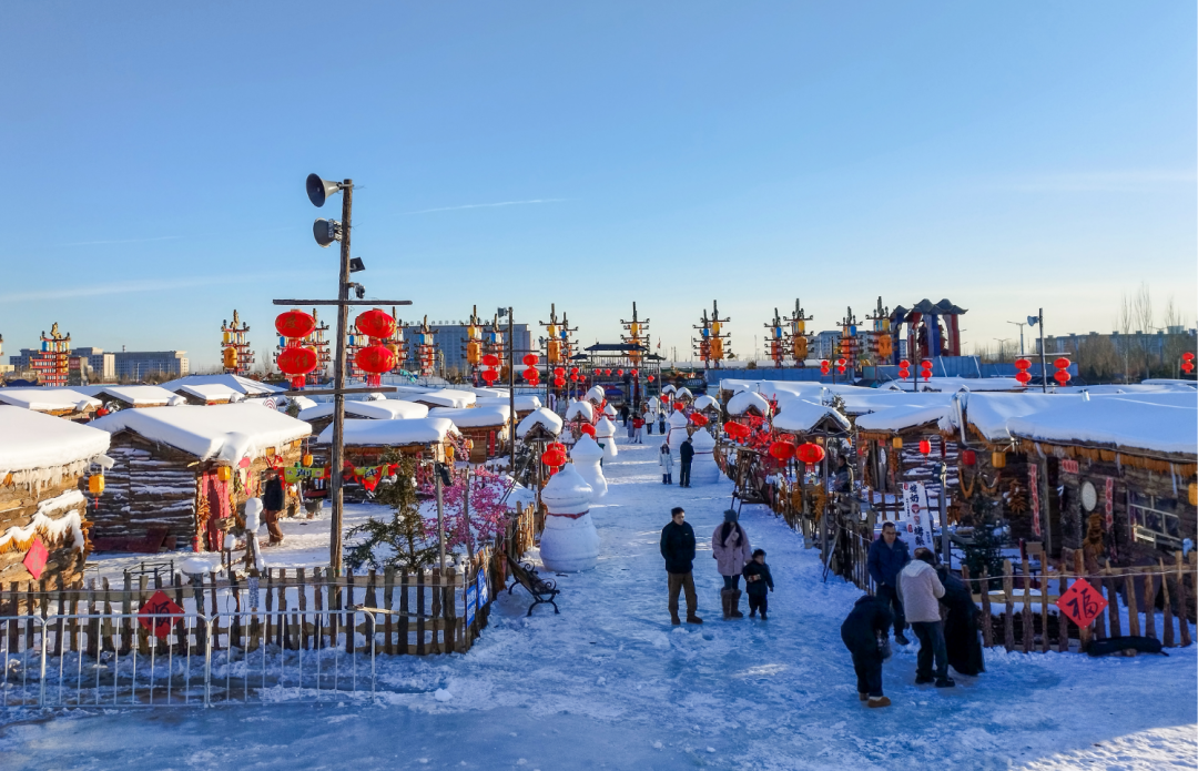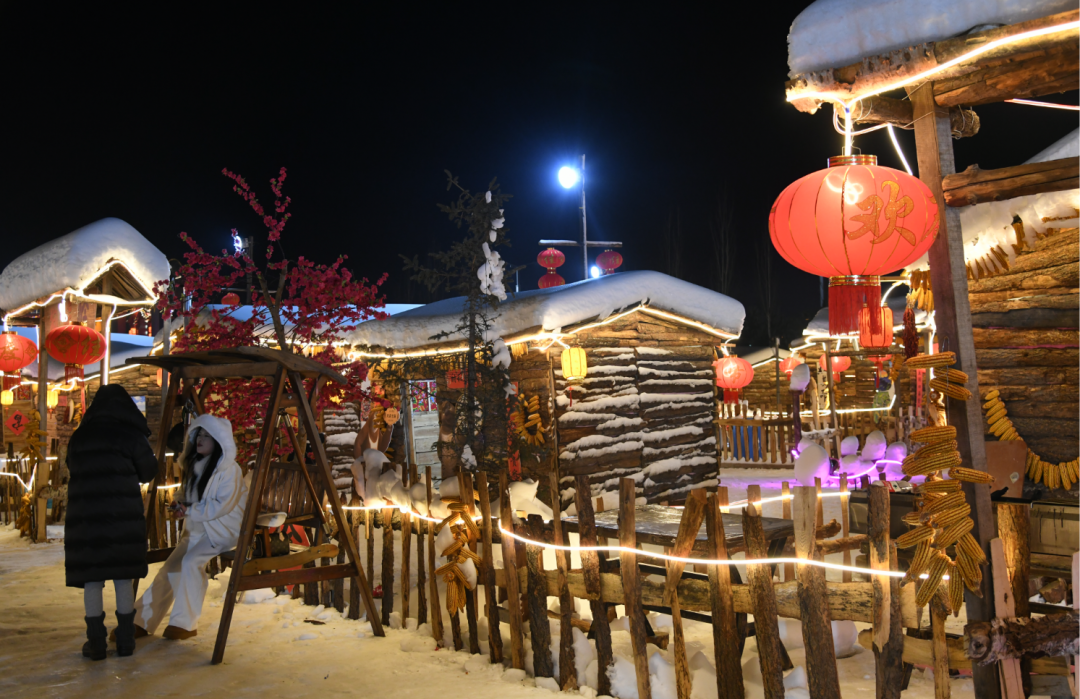 踏入“乌兰雪乡”民俗体验区看到,45座复刻北方传统风貌的院落集群映入眼帘,木栅栏上垂挂的红灯笼与蓬松雪层相映成趣,屋檐下悬垂的雪舌、雪帘勾勒出童话般的轮廓。每个院落都藏着专属打卡场景,游客穿梭其间,拍照打卡,其乐融融,他们的欢声笑语,为这个“雪乡”增添了浓浓的烟火气。