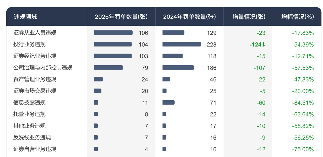 记者注意到,虽然投行业务违规被罚得最重,但纵观2025年全年,投行业务违规罚单数量显著降低。根据企业预警通统计,2025年券商违规领域主要集中在证券从业人员、投行业务、证券经纪业务等方面。与2024年相比,投行业务违规罚单减量最为突出,减少了124张;信息披露违规罚单数量降幅最大,同比减少了84.51%。业内人士认为,投行业务违规罚单减少和信披违规大幅下降,表明证券行业正从“重规模轻合规”转向“质量优先”,监管穿透式治理与行业内生合规能力提升形成共振,推动中介机构“看门人”责任实质落地。