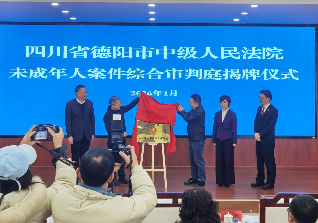 1月6日上午,德阳市中级人民法院未成年人案件综合审判庭揭牌成立,标志着德阳未成年人司法保护工作站在新起点、踏上新征程。省高级人民法院副院长吴涛,德阳市委常委、政法委书记廖凯,德阳市人大常委会副主任朱伟,德阳市政协副主席吴泳,德阳市中级人民法院院长胡旭东出席揭牌仪式。