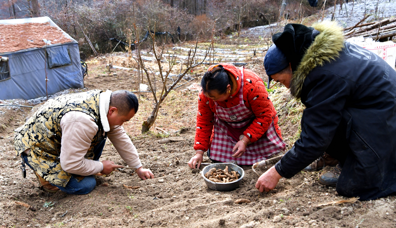 1月5日,30多岁的杨平茂和父母走进半山腰的林地间,一起俯身劳作。枯黄的落叶下,他们小心翼翼地刨开埋好的枯木菌种,将一块块饱满的乌天麻种子均匀摆放,再娴熟地覆盖上一层细细的湿土。
