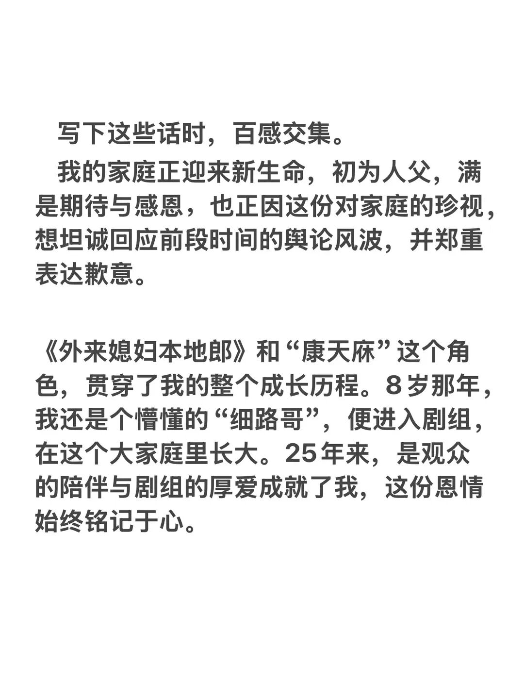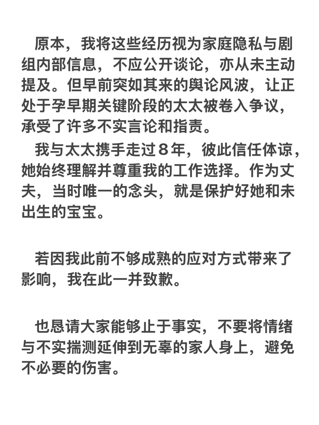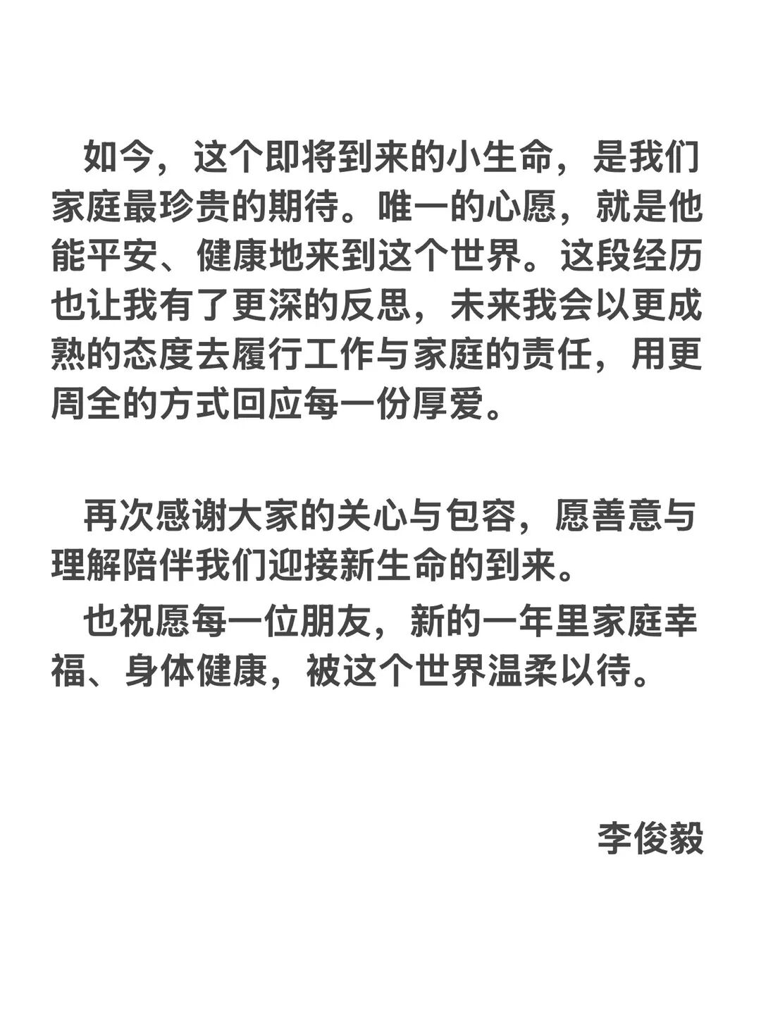 李俊毅称,如今自己的家庭正迎来新生命,与太太携手走过8年,作为丈夫希望能保护好她和未出生的宝宝,并为此前不够成熟的应对方式带来的影响致歉。