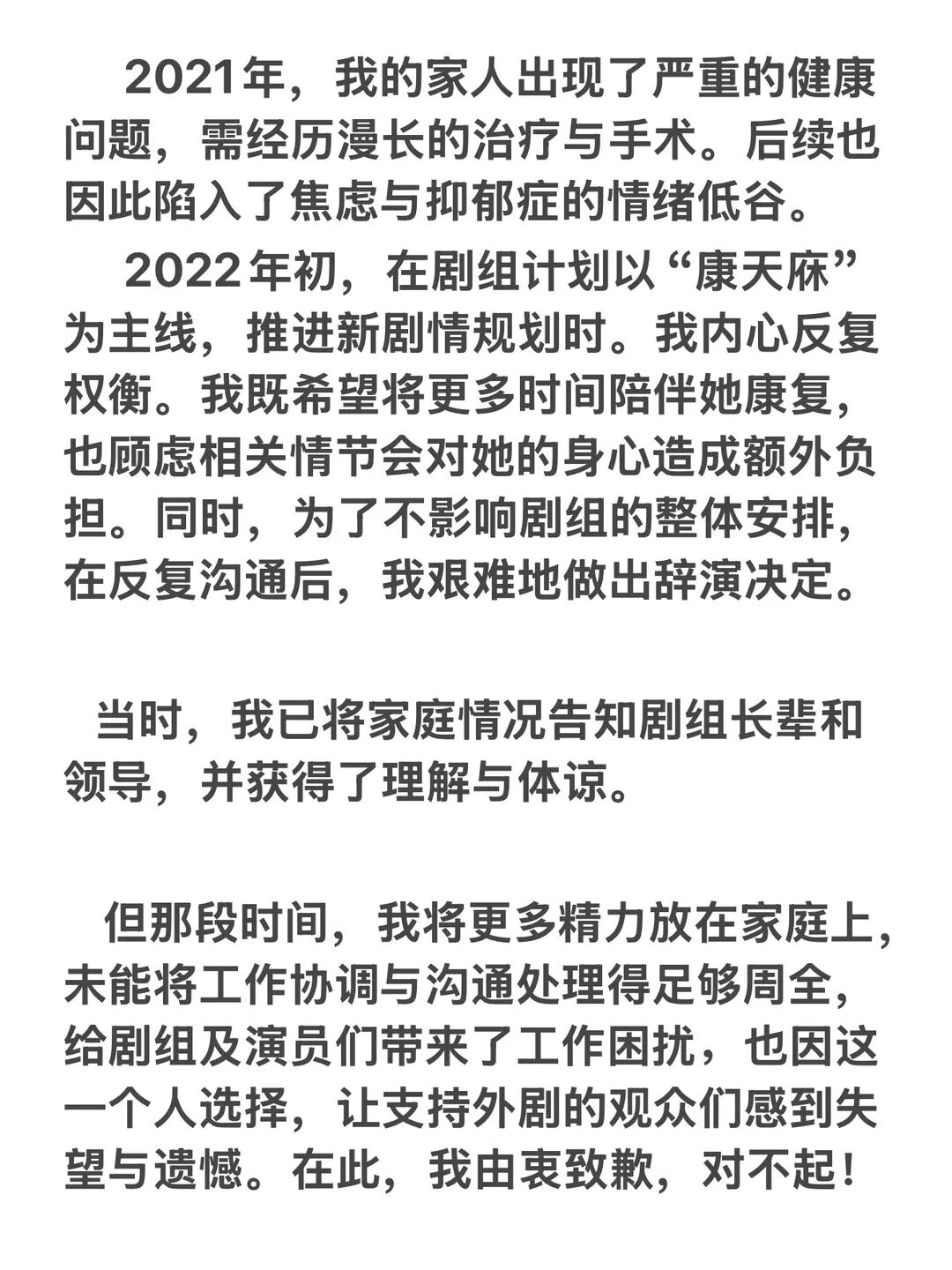 2022年初,在剧组计划以“康天庥”为主线,推进新剧情规划时,李俊毅称既希望将更多时间陪伴她康复,也顾虑相关情节会对她的身心造成额外负担。同时,为了不影响剧组的整体安排,在反复沟通后,艰难地做出辞演决定。