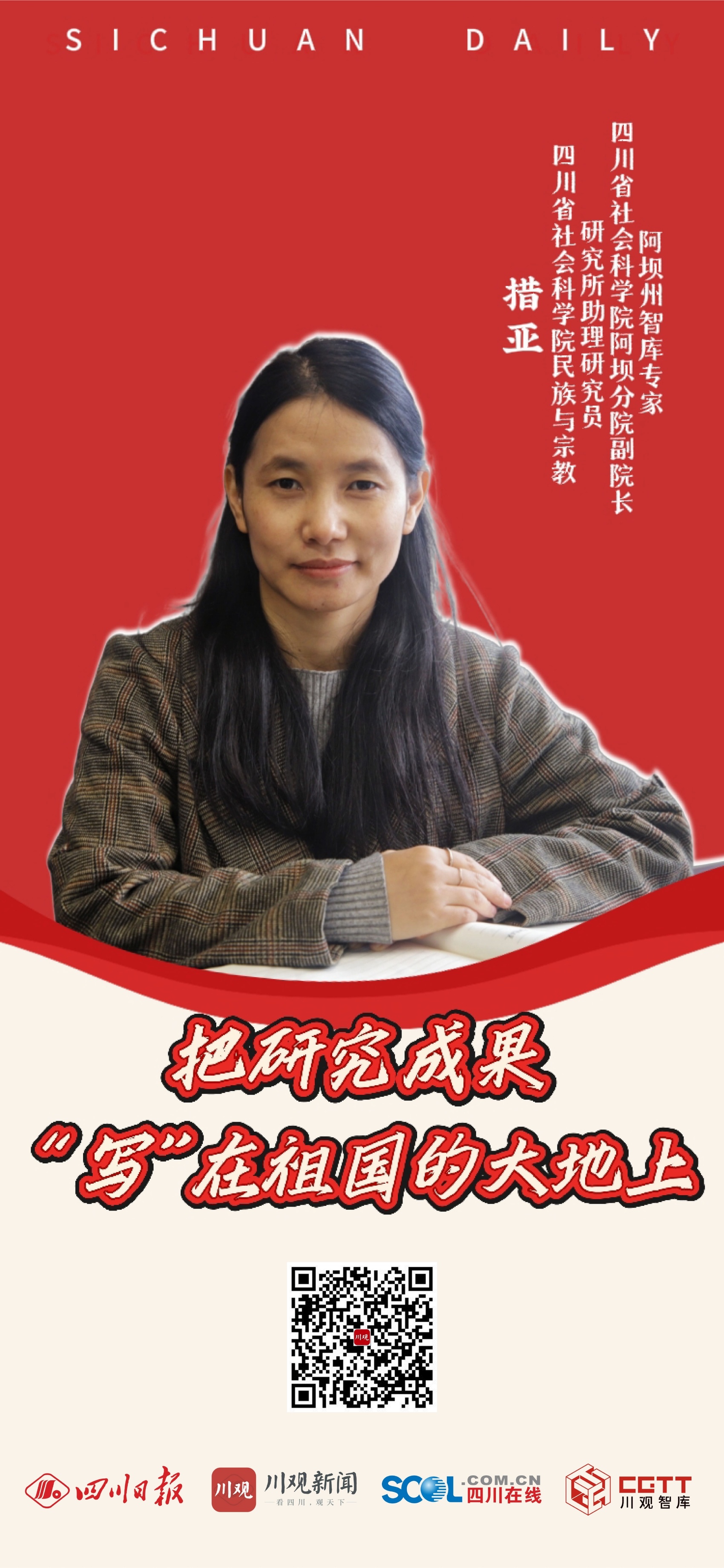 事实上,措亚就来自川西北高原深处的阿坝州阿坝县半农半牧区。得益于家庭的无私奉献和大力支持,她从阿坝县第三小学开启求学路,而后一路求学拿到澳门大学的博士学位,并入职省社科院。知识改变命运,这一路拼搏,此刻在她的身上具象化。她也想用自己的努力和故事,帮助、激励更多高原儿女通过读书,去开创不一样的人生。