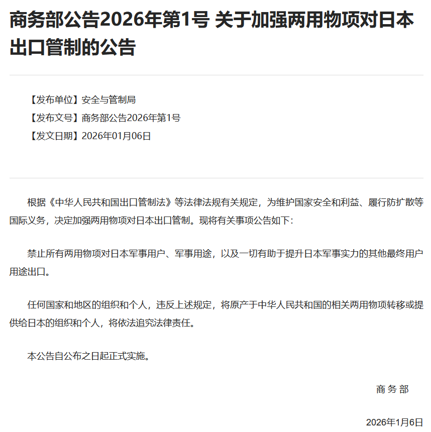 1月6日,商务部网站发布《商务部公告2026年第1号 关于加强两用物项对日本出口管制的公告》。
