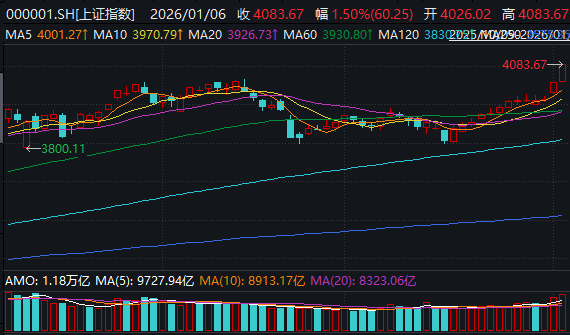 1月6日,大盘继续高举高打,上证指数自开盘便开始反弹,突破2025年高点后反弹明显加速。虽然盘中出现两波快速跳水,但在做多资金的推动下,重心一路抬高,最终在全日最高点收盘。深证成指全日走势同上证指数相仿,收盘站上14000点整数关口。