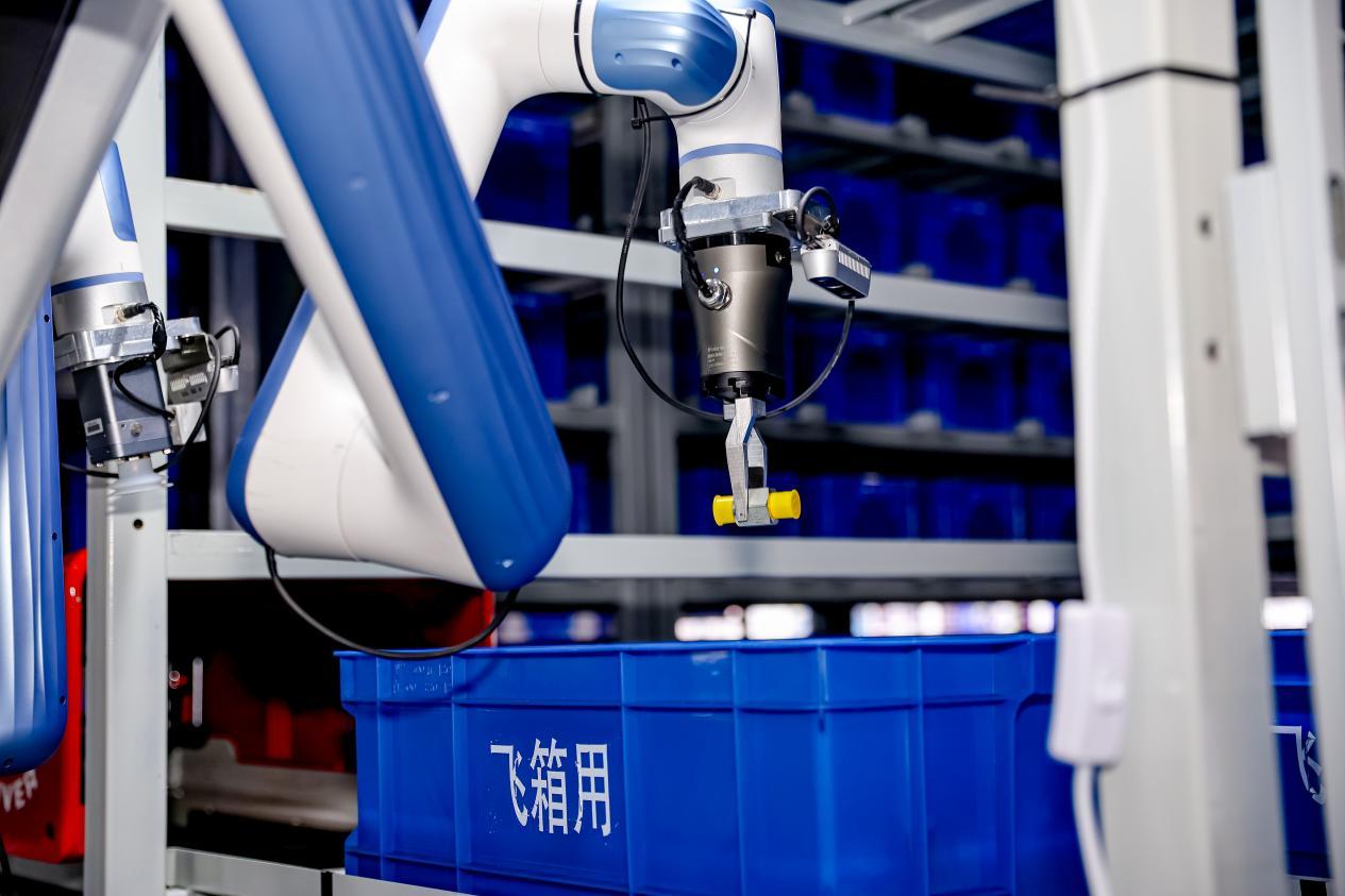 在测试中心,记者观摩了方案的整个流程。首先出场的是飞箱机器人,数秒时间内,它将货架上任意位置的料箱移动到拣选点,随后再由具身拣选机器人拣选零件、具身配送机器人进行配送,整个流程高效且准确,适用于电商零售、智能制造等多元场景。