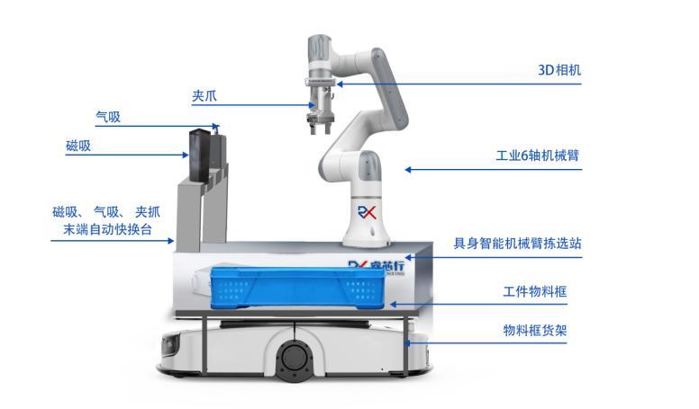 针对更复杂的拣选场景,睿芯行又首创了可实时切换机械手臂末端的具身智能拣选站,还给具身智能赋予了“好眼神”:该方案通过视觉感知或信息交互,识别多种形态的零件,并实时选择不同的机械手臂末端执行器(如夹爪、气吸、磁吸、灵巧手等)进行高效抓取,完成无人化拣选工作。