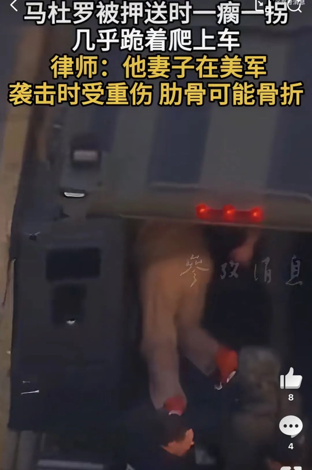 新华社早些时候援引美联社报道称,她的代理律师告诉法庭,弗洛雷斯在美军突袭时受了伤,并请求进行医疗情况汇报:“她受了重伤。我们担心她可能肋骨骨折或严重挫伤。”另有画面显示,马杜罗被押送时一瘸一拐,几乎是跪着爬上车。