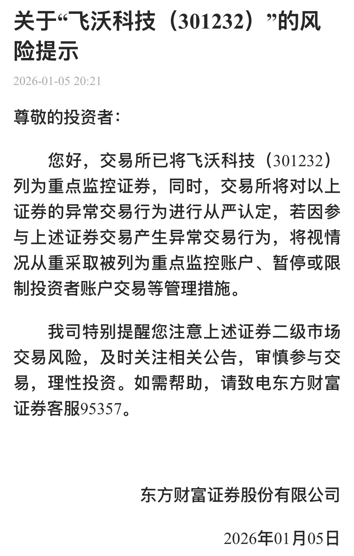 这种明显的预期与现实的“温差”,已引起监管高度关注。东方财富证券1月5日发布风险提示称,“交易所已将飞沃科技列为重点监控证券。同时,交易所将对以上证券的异常交易行为进行从严认定,若因参与上述证券交易产生异常交易行为,将视情况从重采取被列为重点监控账户、暂停或限制投资者账户交易等管理措施。”