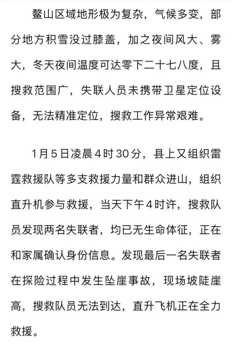 1月5日凌晨4时30分,县上又组织雷霆救援队等多支救援力量和群众进山,组织直升机参与救援,当天下午4时许,搜救队员发现两名失联者,均已无生命体征,正在和家属确认身份信息。发现最后一名失联者在探险过程中发生坠崖事故,现场坡陡崖高,搜救队员无法到达,直升飞机正在全力救援。