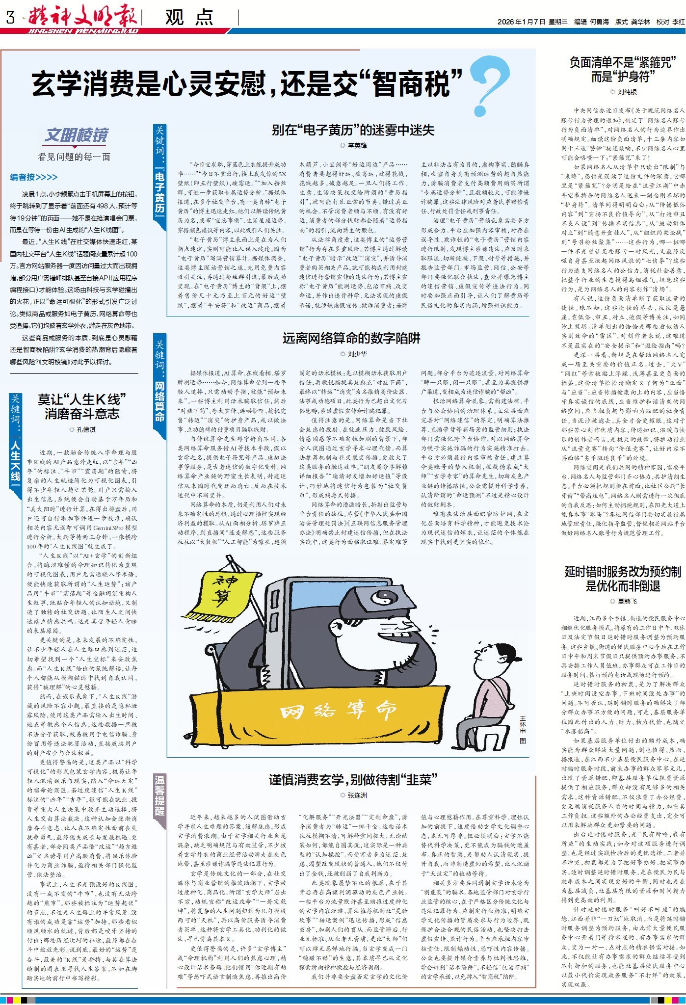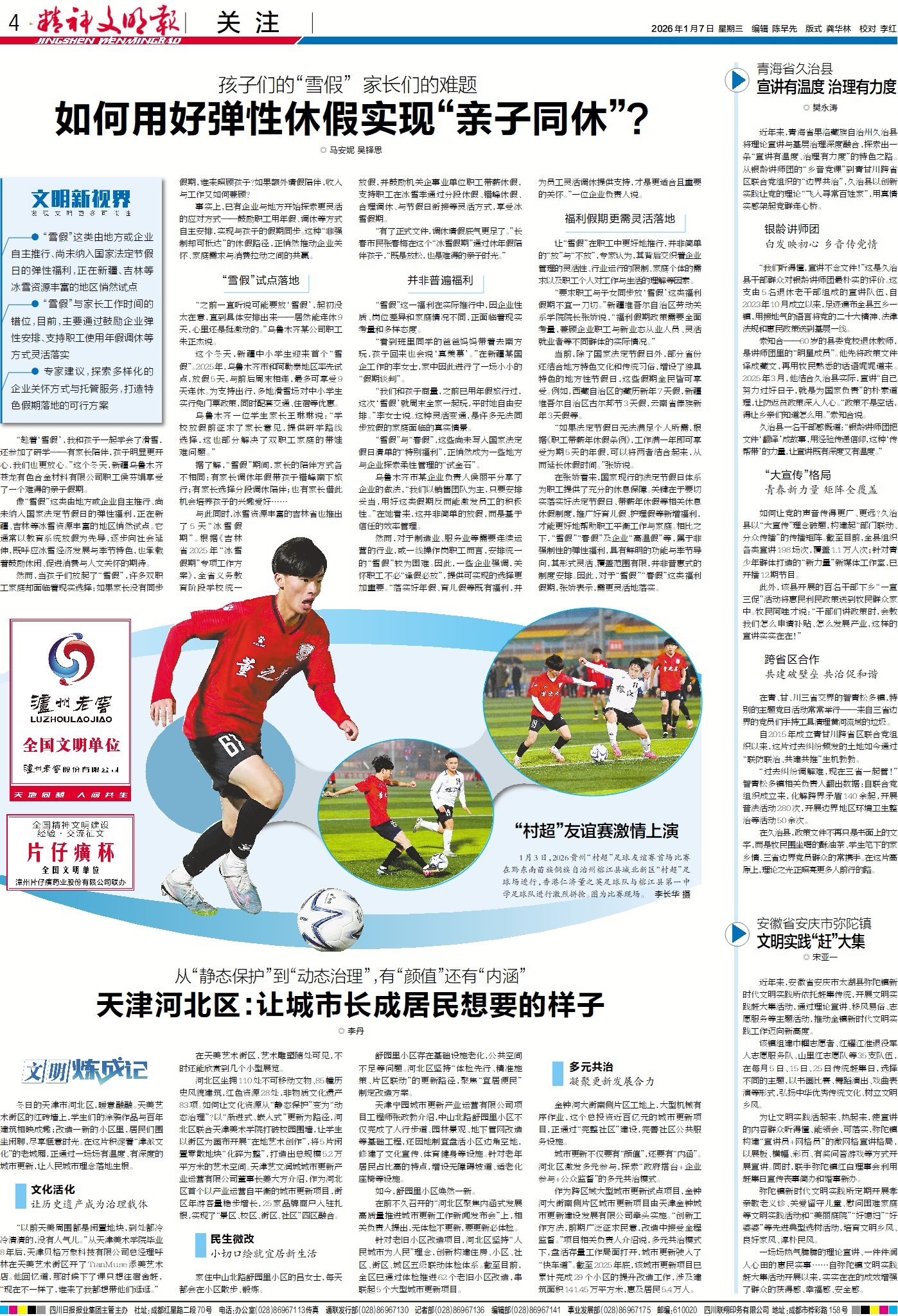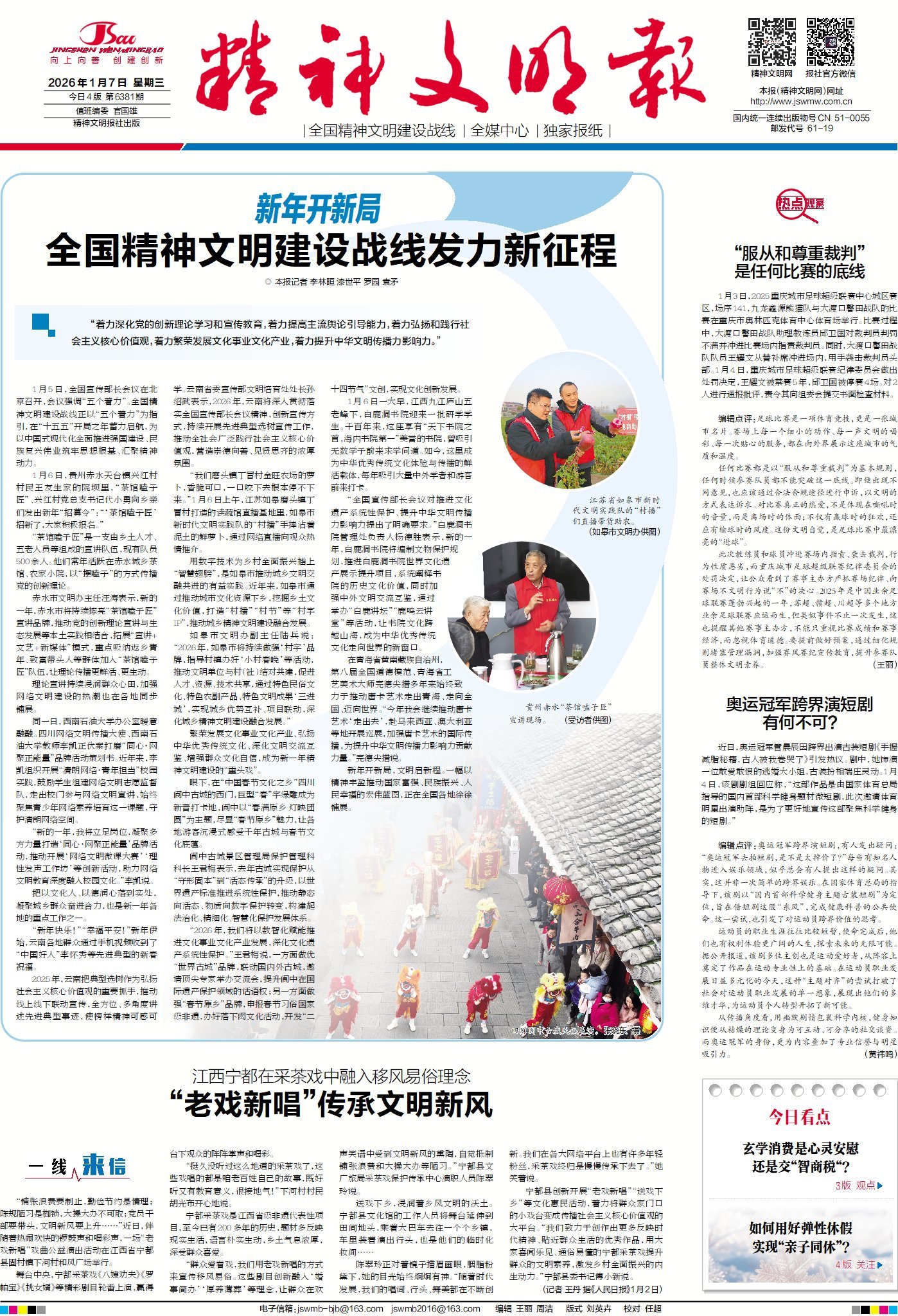 今日版面“早”知道:1版头条聚焦全国精神文明建设战线新年开新局,发力新征程;《热点观察》栏目关注重庆城市足球超级联赛中不文明现象,“服从和尊重裁判”是任何比赛都要坚守的文明底线;奥运冠军跨界演短剧,是多元发展、不断突破自我的态度,值得被认可与期待。3版《文明棱镜》栏目探讨玄学消费的热潮背后,是心灵安慰还是交“智商税”?4版《文明炼成记》栏目带你走进天津市河北区,看有“颜值”有“内涵”的城市更新,如何成为居民想要的样子。