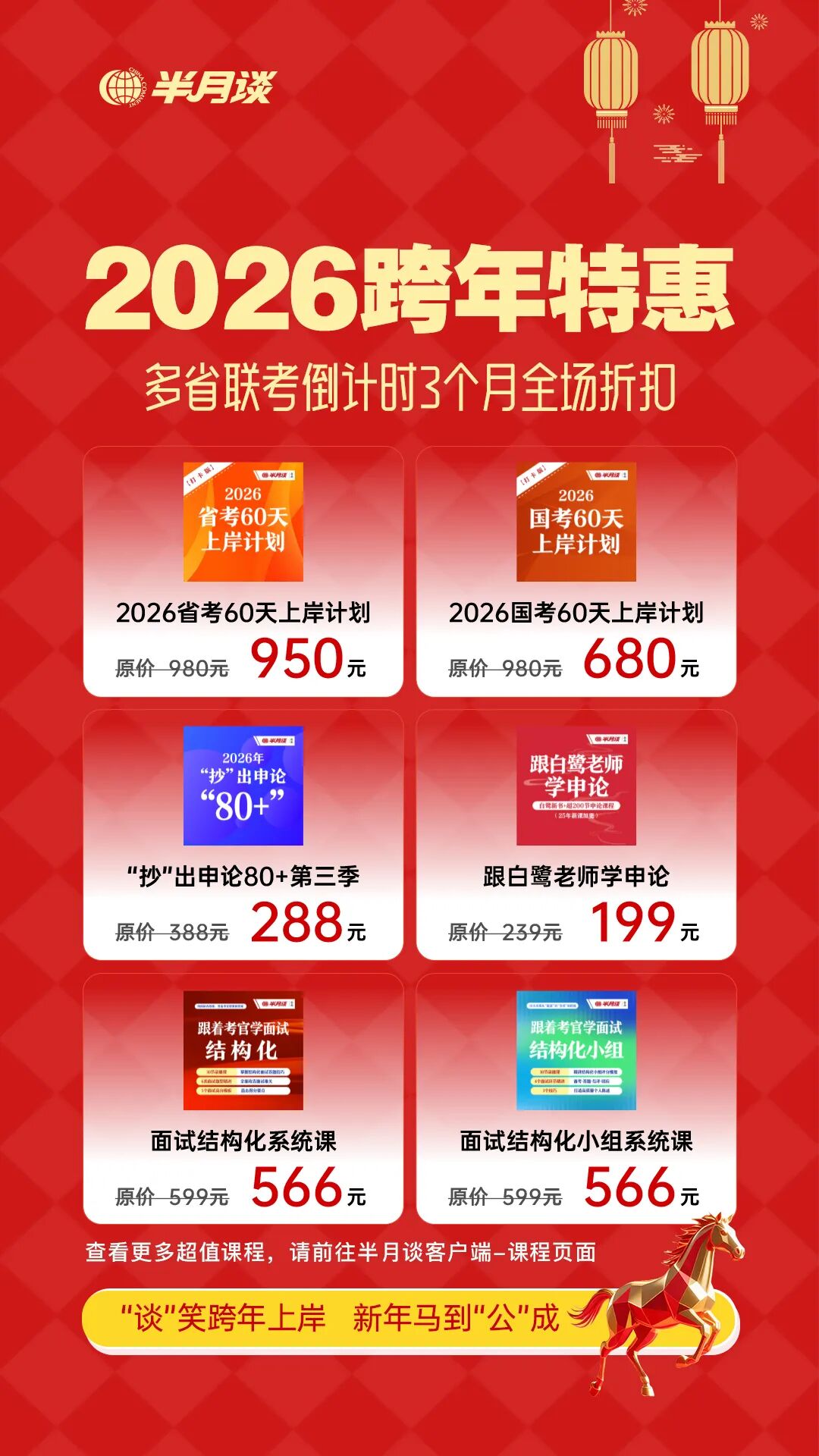 距离2026多省联考笔试还有不到3个月的时间,谈谈精选了一批口碑打卡好课,设置了跨年特惠限时折扣。不用自己制定计划,每天跟着课程安排,全勤打卡学习,就能返还全部学费!