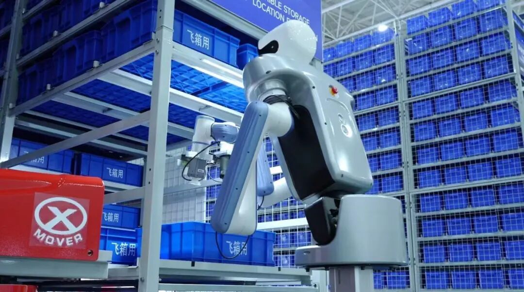 在测试中心,一台上半身人形、下半身轮式底盘的具身拣选机器人正在进行零件拣选与配送工作。面对不同形状、不同大小的零件,机器人可以“聪明”地进行识别,并根据该零件适合的拣选方式,选择左右两只机械手臂中的一只进行拣选。据介绍,该方案先由飞箱机器人用数秒时间将货架上任意位置的料箱移动到拣选点,再通过具身拣选机器人拣选零件、具身配送机器人进行配送,可完全取代人工完成从仓库拣选到工位配送的全流程,覆盖从电商零售到智能制造的多元场景。