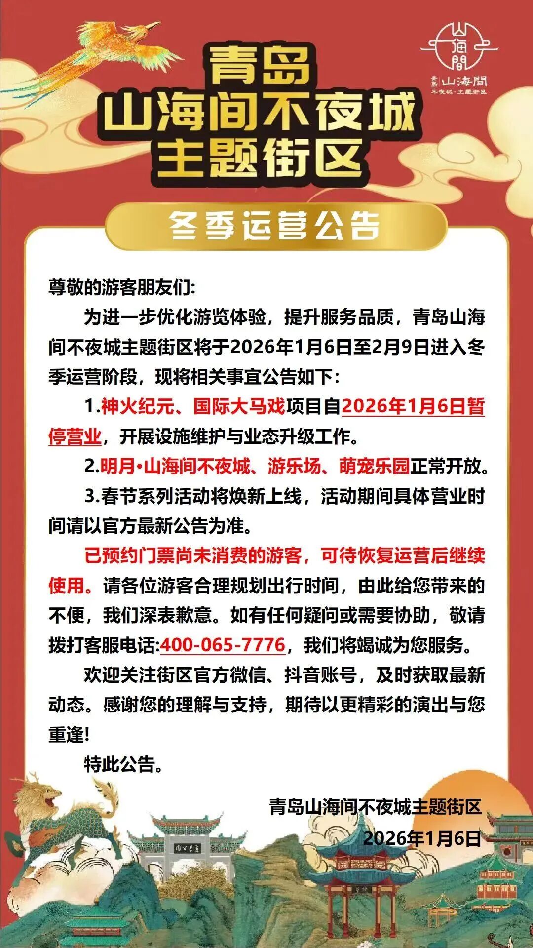 发布冬季运营公告,