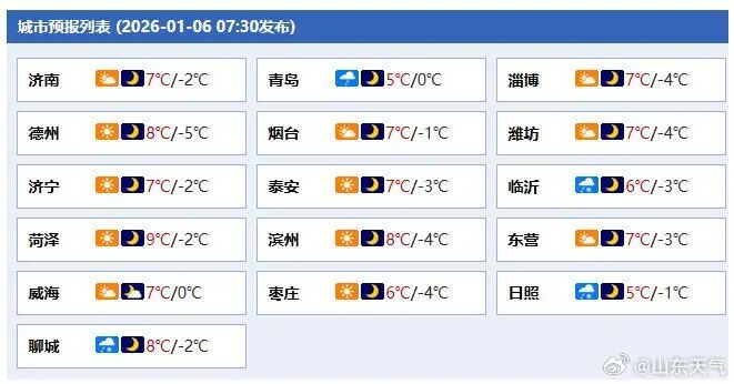6日白天到夜间,临沂和日照天气多云间阴局部有雨夹雪,其他地区天气晴间多云;菏泽、济宁、鲁西北和鲁中地区6日早晨到上午有雾或轻雾。南风转北风,半岛地区4级阵风5~6级,其他地区3~4级。