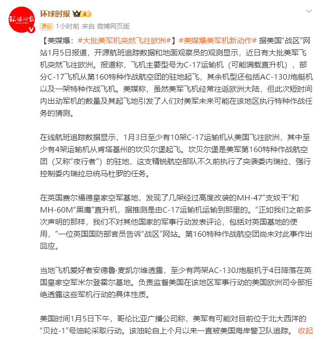 据环球时报援引美国“战区”网站1月5日报道,开源航班追踪数据和地面观察员的观测显示,近日有大批美军飞机突然飞往欧洲。