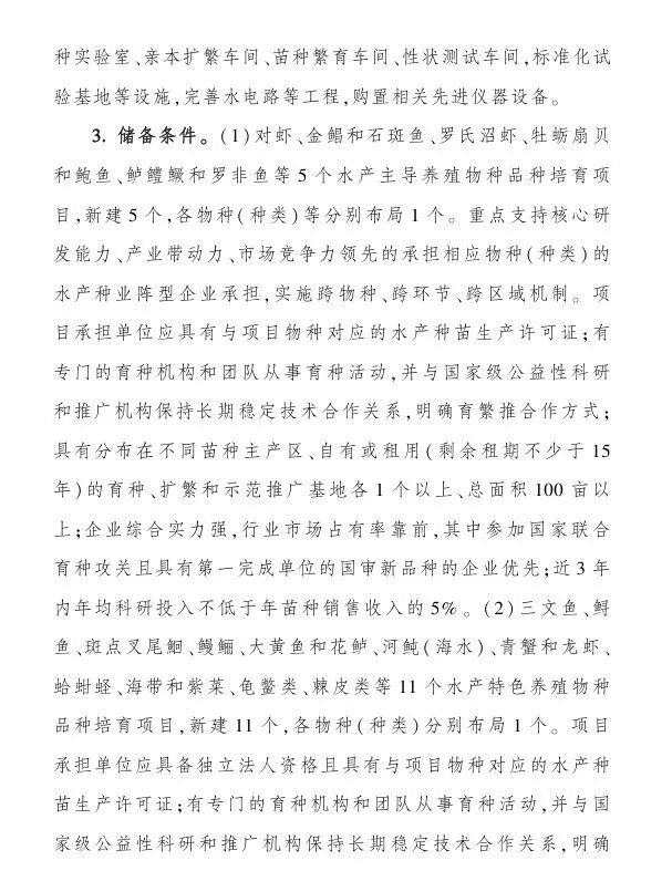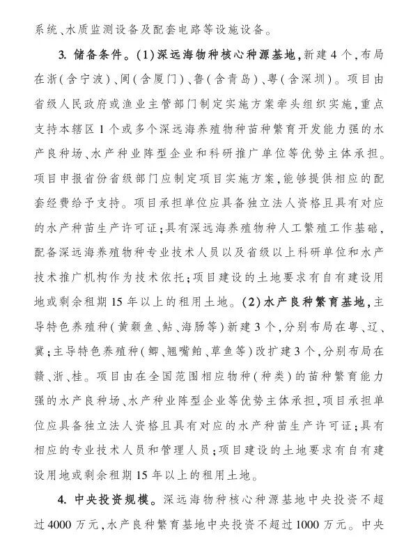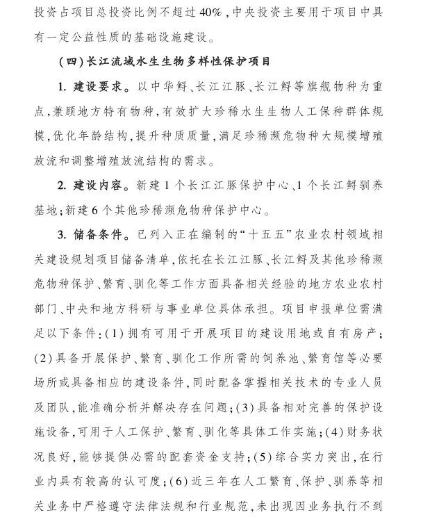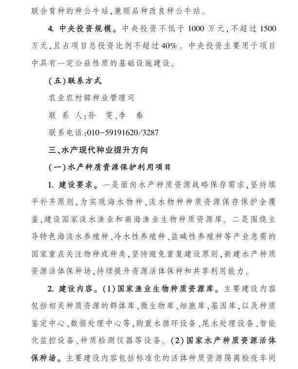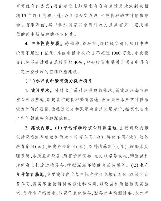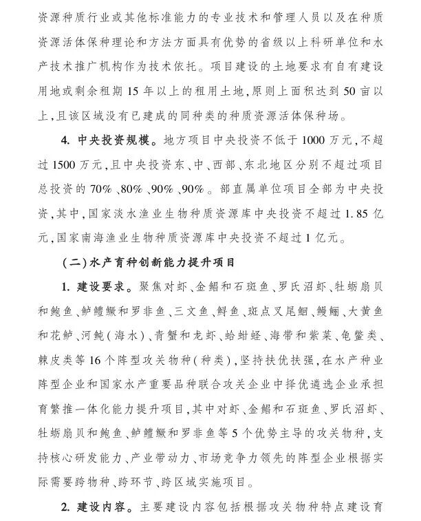 (一)水产种质资源保护利用项目,中央财政支持:1000-1500万;(二)水产育种创新能力提升项目,中央财政支持:1000-1亿;(三)水产良种繁育能力提升项目,中央财政支持:1000-4000万;(四)长江流域水生生物多样性保护项目,中央财政支持:不超过1亿;