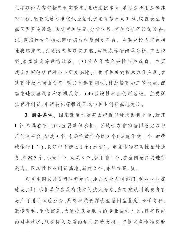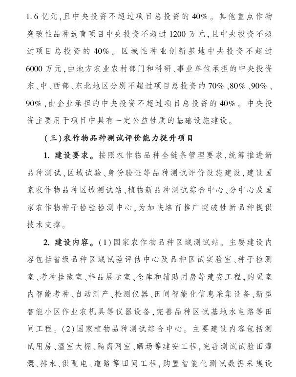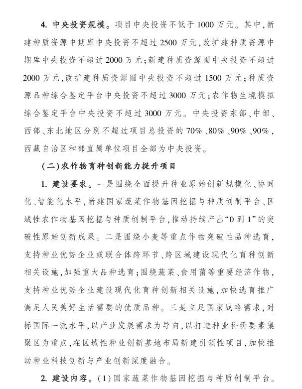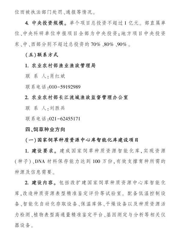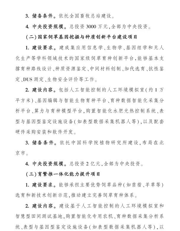 (一)国家饲草种质资源中心库智能化库建设项目,中央财政支持:不超过3000万,全部为中央财政投资;(二)国家饲草基因挖掘与种质创新平台建设项目,中央财政支持:不超过2亿,全部为中央财政投资;(三)育繁推一体化能力提升项目,中央财政投资:不超过3000万元;(四)区域性品种测试评价中心(站)建设项目,中央财政支持:不超过2000万元;(五)区域性良种繁育基地建设项目,中央财政支持:不超过2000万元;