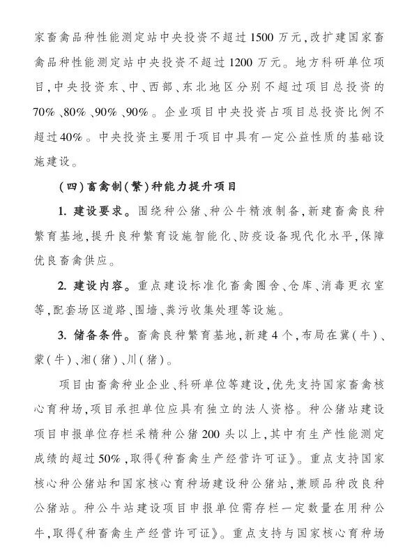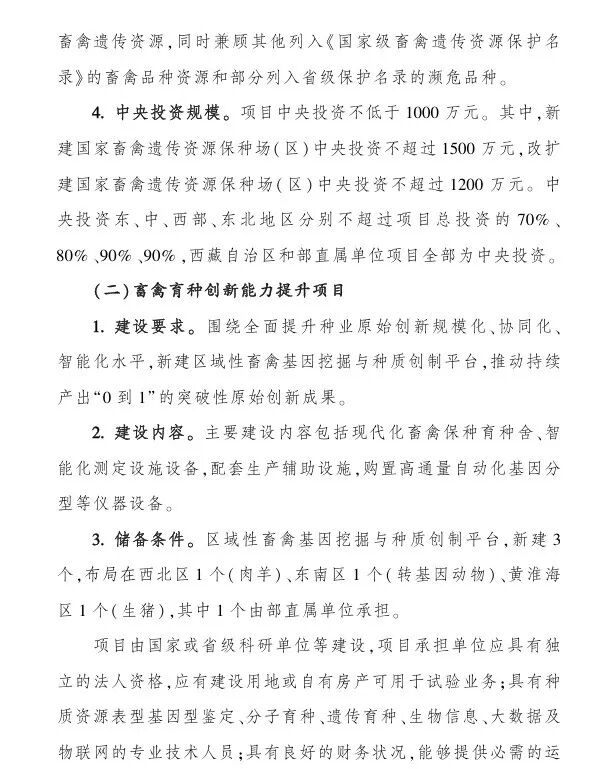(一)畜禽种质资源保护利用能力提升项目,中央财政支持:1000-1500万;(二)畜禽育种创新能力提升项目,中央财政支持:1000-2000万;(三)畜禽品种性能测定能力提升项目,中央财政支持:1000-1500万;(四)畜禽制(繁)种能力提升项目,中央财政支持:1000-1500万;