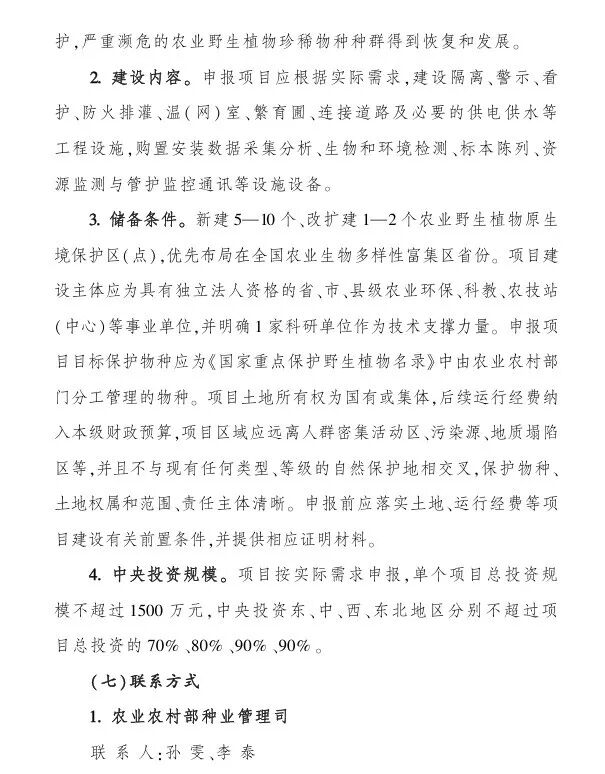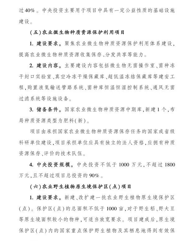 (一)农作物种质资源保护利用项目;中央财政支持:1000-3000万;(二)农作物育种创新能力提升项目;中央财政支持:1000-6000万;(三)农作物品种测试评价能力提升项目;中央财政支持:1000-2000万;(四)农作物良种繁育能力提升项目,中央财政支持:1000-1500万;(五)农业微生物种质资源保护利用项目,中央财政支持:1000-1800万;(六)农业野生植物原生境保护区(点)项目,中央财政支持:不超过1500万;