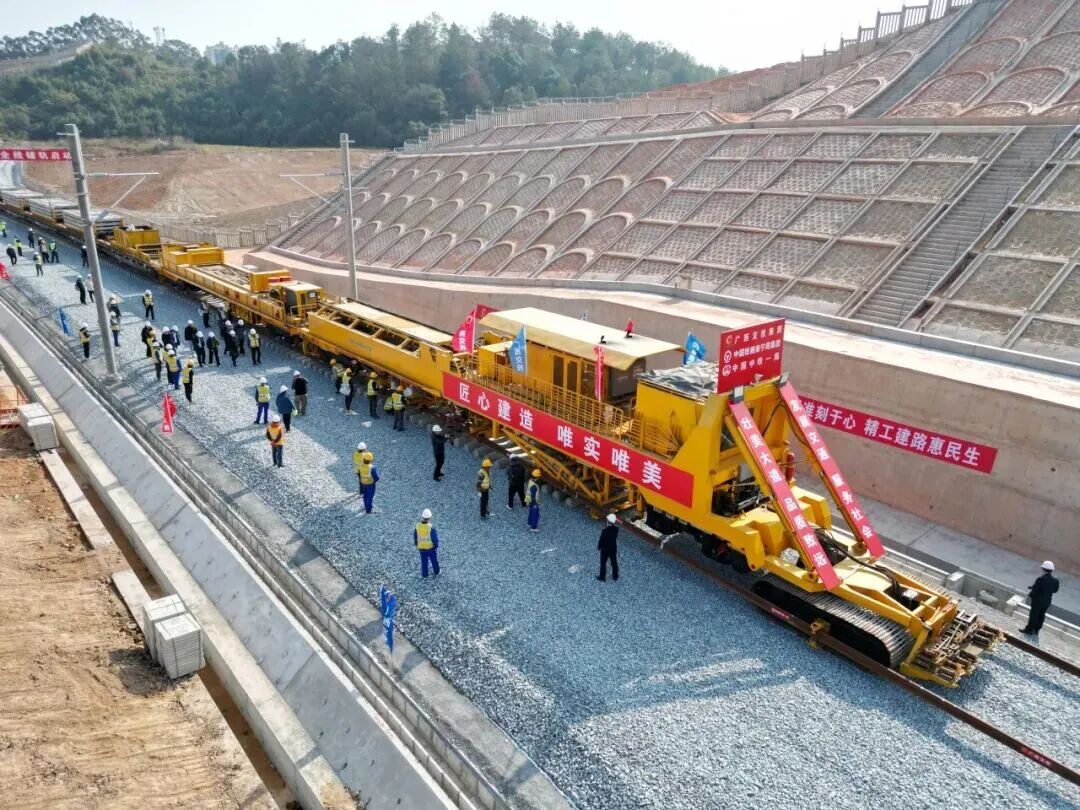 南宁铁路公众号消息:1月6日,在柳州至广州铁路柳州至梧州段(以下简称柳梧铁路)铺轨施工现场,作业人员熟练地操控着我国自主研发的CPG500型铺轨机组平稳精准地将一对500米长钢轨铺设到线路上,标志着柳梧铁路正式进入全线铺轨阶段。
