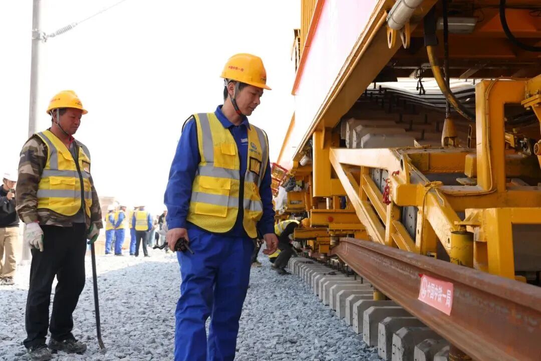 为保证铺轨作业的连续性和稳定性,项目建设团队优化施工方案,调整资源配置,全程采用双机分区联合作业模式,配备钢轨运输车4列,在有砟轨道段落依托我国自主研发的CPG500型铺轨机组高效作业能力,采用“单枕连续法”进行铺设;在无砟轨道段落使用WZ500E型铺轨机采用“推送法”进行铺设。