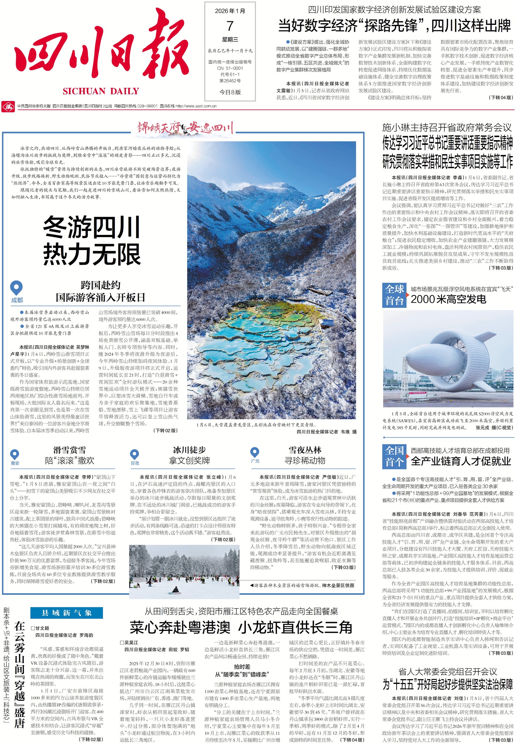 近年来,依托独特的冰雪资源与持续创新的业态,四川正以多元、沉浸的冰雪体验,吸引全球目光。从西岭雪山沸腾的国际开板日,到唐家河暗夜丛林的动物寻踪;从海螺沟冰川徒步的挑战与奖牌,到雅安雪中大熊猫的顽皮身影,“冷资源”因创意与运营而转化为“热经济”。关注一版,一起走进四川的雪域山川。