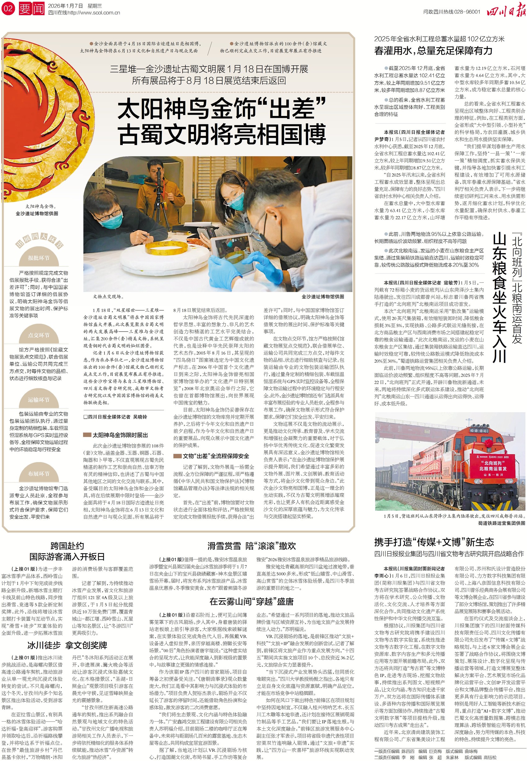 1月18日,“双星耀世——三星堆—金沙遗址古蜀文明展”将在中国国家博物馆开展,200余(件)套文物组团亮相,系统呈现青铜时代古蜀文明的灿烂图景,金沙遗址博物馆备受瞩目的太阳神鸟金饰、金沙金面具将限时展出。展览将持续至8月18日。关注二版,看这些文物怎么安全“出差”。