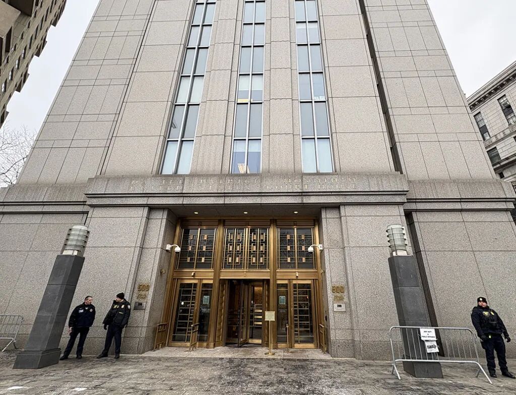5日,美国纽约南区联邦地区法院警戒森严,大批执法人员维持秩序。法院大楼内,上百名记者和民众一早便排起长队,等待经过安检后进入法庭旁听。